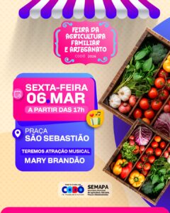 A Prefeitura de Codó promoverá, na próxima sexta-feira (06), a 7ª edição da Feira da Agricultura Familiar e Artesanato, um dos eventos mais tradicionais e representativos do município. A programação terá início às 17h, na Praça São Sebastião, reunindo agricultores, artesãos e a comunidade em um ambiente marcado pela cultura, tradição e oportunidades de negócios.