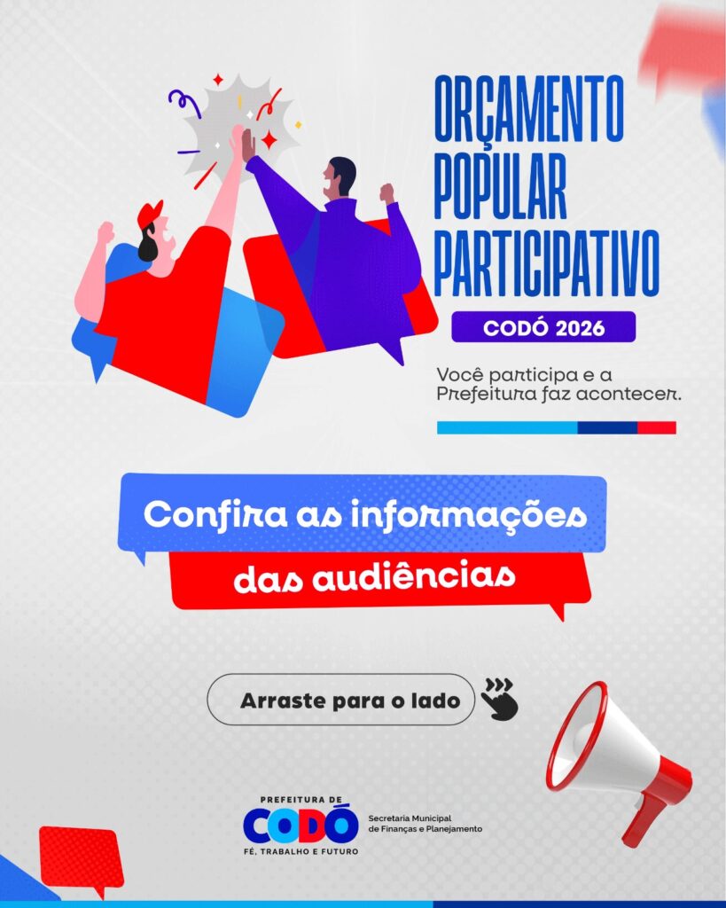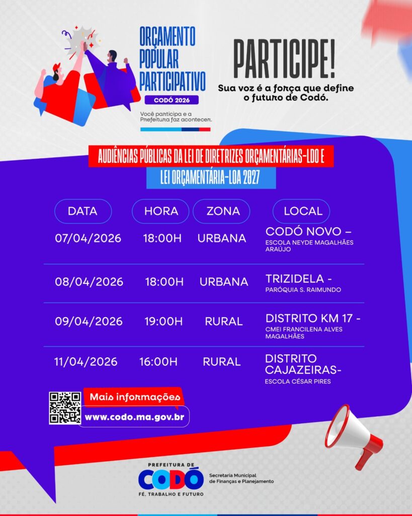 A Prefeitura de Codó, por meio da Secretaria Municipal de Finanças e Planejamento convida toda a população codoense para participar das Audiências Públicas do Orçamento Participativo 2026.