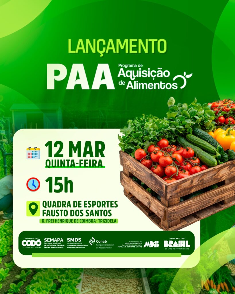 No próximo dia 12 de março, o município de Codó dará início às ações de 2026 do Programa de Aquisição de Alimentos (PAA) com a entrega de 700 Cestas Verdes, totalizando 20 toneladas de produtos oriundos da agricultura familiar. A ação marca oficialmente o lançamento do programa no município neste ano.