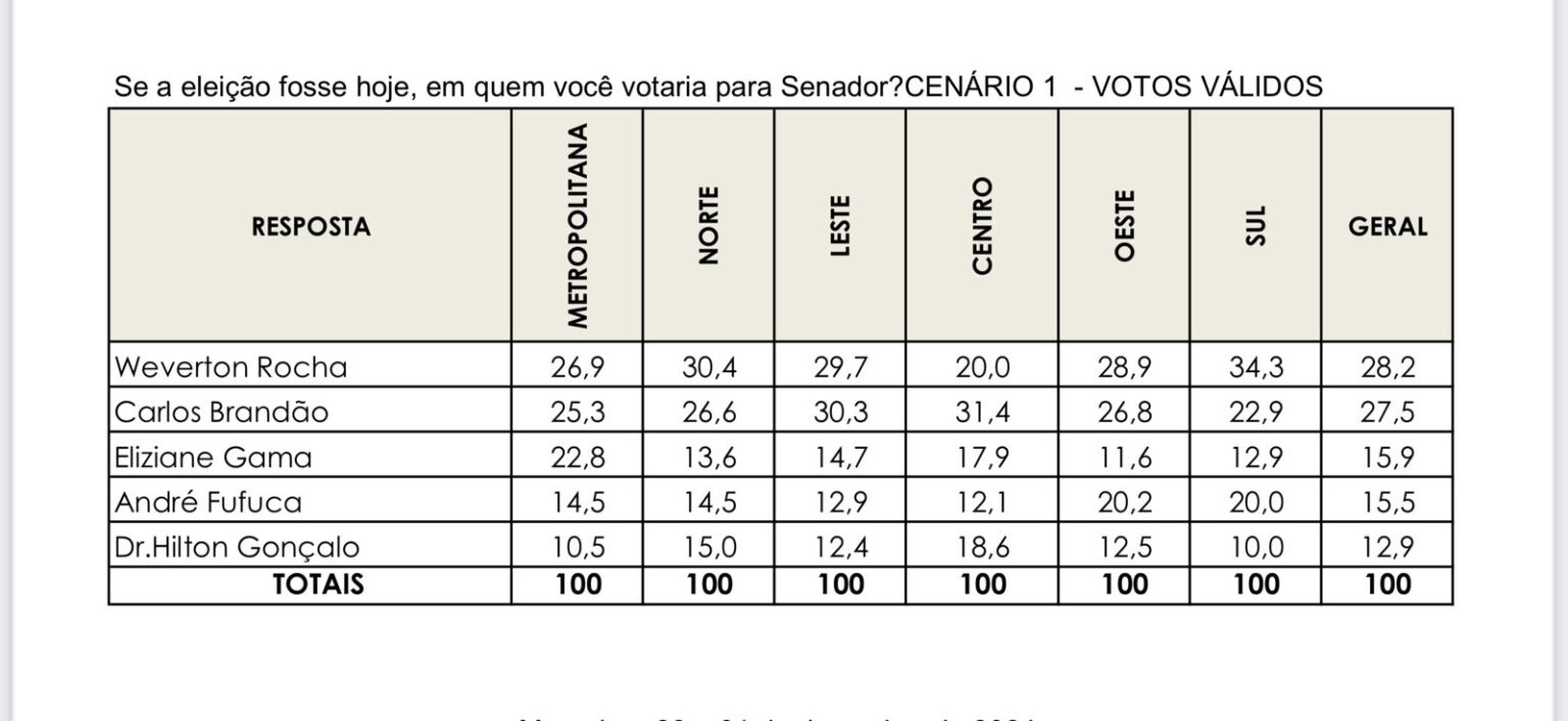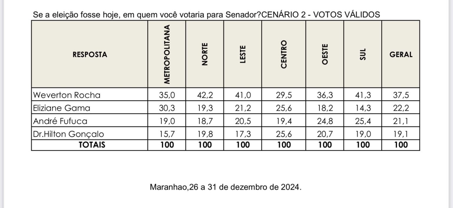 Para o Senado, a consulta é liderada pelo senador Weverton Rocha (PDT), que aparece à frente em todos os cenários estimulados. O governador Carlos Brandão (PSB) ocupa a segunda posição quando incluído na pesquisa. Porém, quando Brandão é retirado do cenário, a senadora Eliziane Gama (PSD) assume a segunda colocação. Uma surpresa foi o desempenho do ex-prefeito de Santa Rita, Hilton Gonçalo (Mobiliza), que pontuou perto dos 20% das intenções de voto, consolidando-se como um nome relevante na disputa.