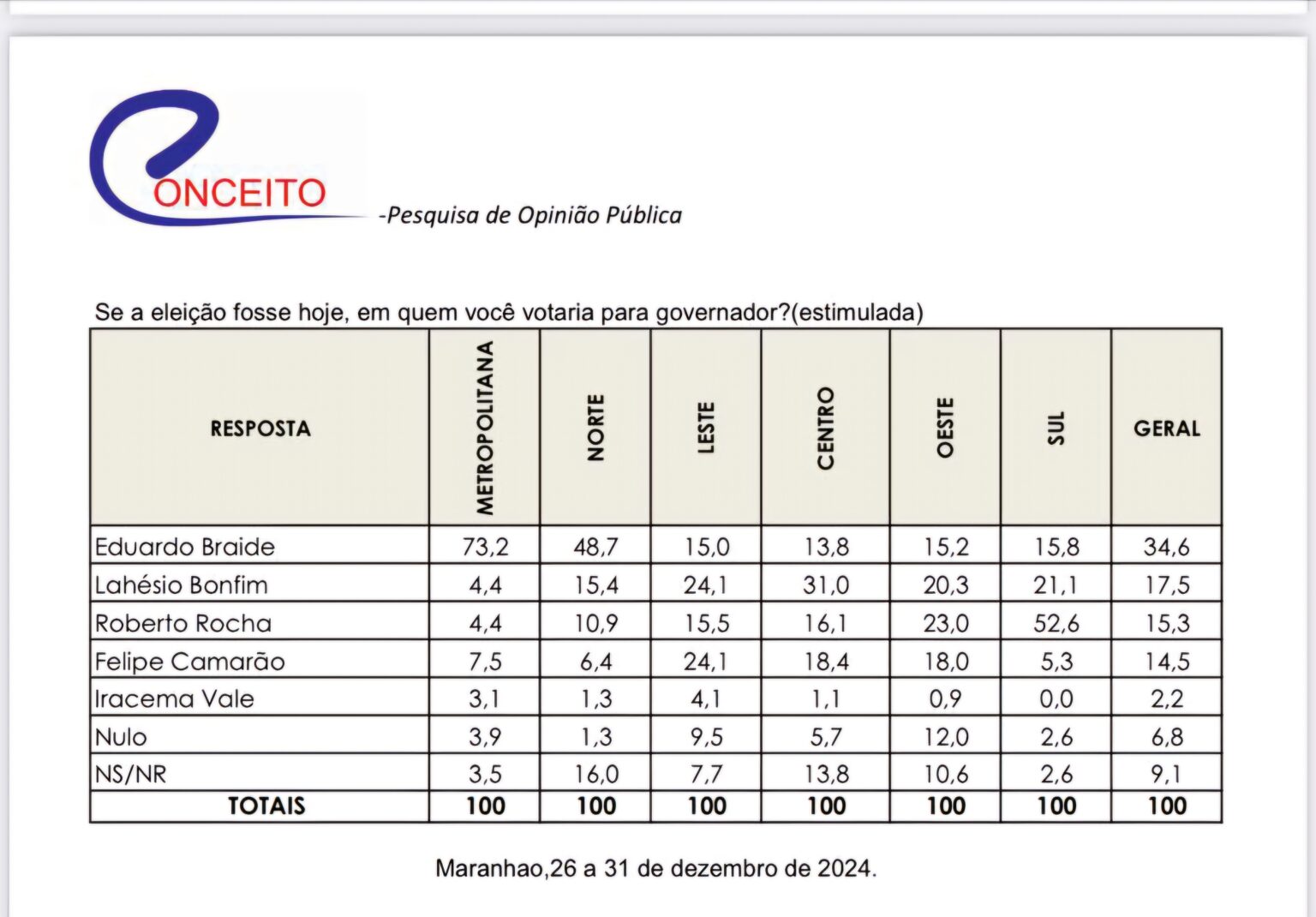 Uma pesquisa realizada pelo Instituto Conceito – e à qual o Blog do Gilberto Léda obteve acesso exclusivo – avaliou as intenções de voto para os cargos de governador e senador do Maranhão nas eleições de 2026. O levantamento, realizado entre os dias 26 e 31 de dezembro de 2024, ouviu mais de 1 mil pessoas, em 47 municípios maranhenses, e revelou uma liderança expressiva do prefeito de São Luís, Eduardo Braide (PSD), na disputa pelo Governo do Estado, além de um cenário embolado para o Senado.