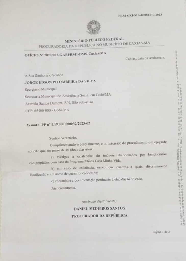No ofício, o Procurador da República solicita que seja averiguado a “existências de imóveis abandonados por beneficiários contemplados com casa do Programa Minha Casa, Minha Vida” em Codó. O representante do Ministério Público Federal, Daniel Medeiros Santos, cita ainda que caso seja confirmada a existência de casas abandonadas, que o secretário Jorge Pitombeira “especifique quantos e quais, discriminado localização e em nome de quem foi concedido”.