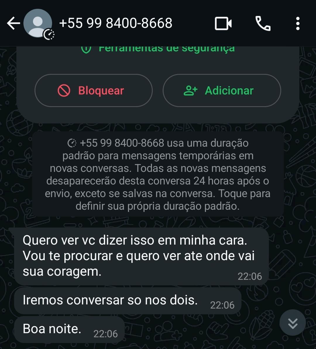 “Quero ver vc dizer isso em minha cara. Vou te procurar e quero ver ate onde vai sua coragem. Iremos conversar só nós dois. Boa noite” – disse Assis pelo WhatsApp.