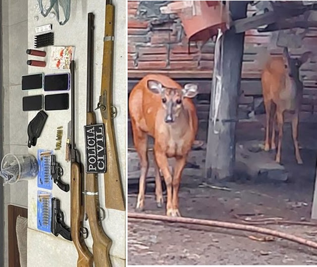 Nos endereços alvos dos mandados de busca, os policiais apreenderam quatro armas de fogo (revólver calibre 32, espingarda calibre 22 e mais duas espingardas de antecarga), além de acessórios para arma de fogo (coldres. etc.), munições de calibre diversos, animais silvestres (dois veados, duas cutias e um jabuti) e 13 porções de crack.