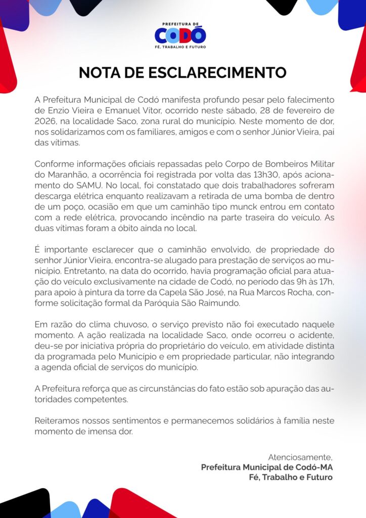 A Prefeitura Municipal de Codó manifesta profundo pesar pelo falecimento de Enzio Vieira e Emanuel Vítor, ocorrido neste sábado, 28 de fevereiro de 2026, na localidade Saco, zona rural do município. Neste momento de dor, nos solidarizamos com os familiares, amigos e com o senhor Júnior Vieira, pai das vítimas.