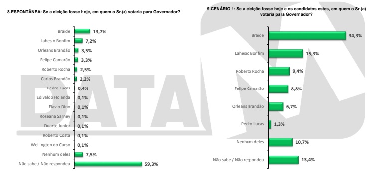 Na pesquisa espontânea, Braide aparece com 13,7% das intenções de voto, seguido por Lahesio Bonfim (7,2%) e Orleans Brandão (3,5%). Outros nomes citados foram Felipe Camarão (3,3%), Roberto Rocha (2,5%) e Carlos Brandão (2,2%). No entanto, a maioria (59,3%) não soube ou preferiu não responder.
