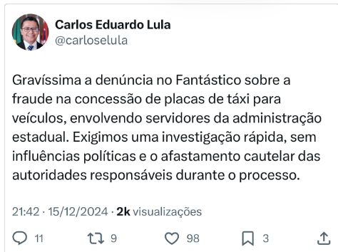 O deputado estadual Carlos Lula (PSB) manifestou-se na noite deste domingo, 15, sobre a reportagem do Fantástico denunciando a compra irregular de veículos como táxis no Maranhão.