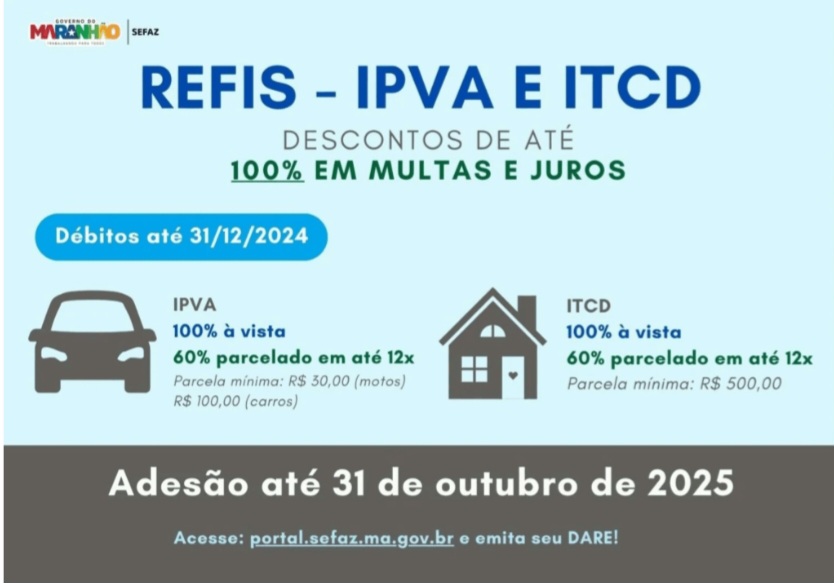 O Governo do Maranhão, por meio da Secretaria de Estado da Fazenda (Sefaz-MA), lançou o Programa de Pagamento e Parcelamento de Créditos Tributários – Refis 2025, destinado a contribuintes com débitos de IPVA e ITCD constituídos até 31 de dezembro de 2024, inscritos ou não em dívida ativa.Concursos públicos