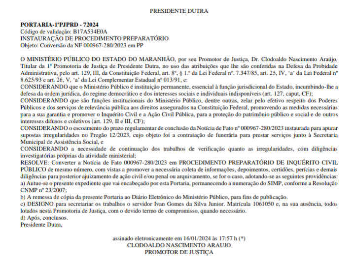 Conforme a Portaria do Ministério Público Estadual, o objetivo da investigação é o pregão 12/2023, cujo objeto é a contratação de funerária para prestar serviços junto à Secretaria Municipal de Assistência Social de Presidente Dutra.